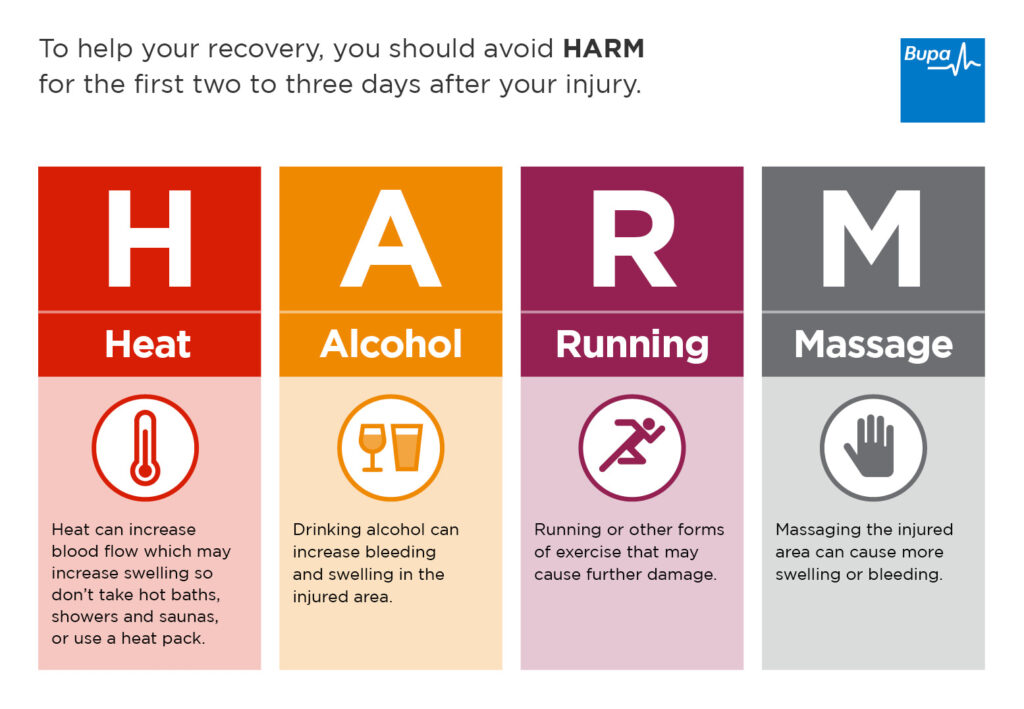 I = ice ရေခဲကပ်ခြင်းသည် နာကျင်မှု ရောင်ရမ်းမှု တို့ကို လျော့ကျစေသည်။ ရေခဲကို ၂၀ မိနစ် ၂ နာရီ ခြားတခါ (၄၈ နာရီ ) ကပ်ပါ ၊ အသားနှင့် တိုက်ရိုက်မထိစေရန် အဝတ်စသည့် တခုခု ခံထားပါ