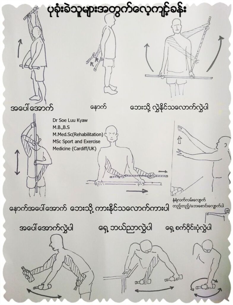 အောက်ဖော်ပြပါ ပုံများသည် ပုခုံးခဲရောဂါအတွက် အိမ်တွင်လုပ်ရန် လေ့ကျင့်ခန်း များဖြစ်ပါသည်။ လေ့ကျင့်ခန်းမစမီ ရေနွေးအိတ် ၁၅ မိနစ် ၂၀ မိနစ်ခန့် ကပ်ပေးခြင်းဖြင့် ပိုမိထိရောက်စေပါသည်။